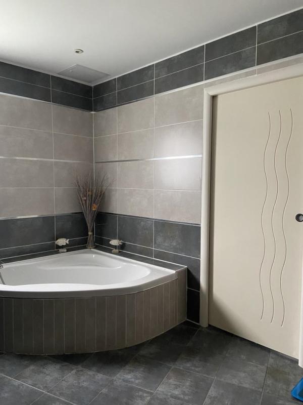 Cette maison comprend 6 pièces dont au rez-de-chaussée, 1 suite parentale avec dressing et salle de bains (douche italienne, baignoire), 1 wc, 1 buanderie, 1 bureau, 1 grande pièce à vivre équipée d’une cheminée suspendue, cuisine équipée ouverte avec arrière cuisine.