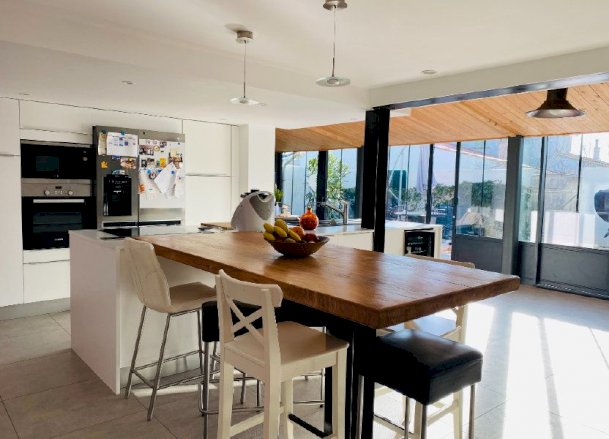 Cuisine ouverte sur salon/salle à manger d'un totale de 70m2 et une véranda de 35 m2.