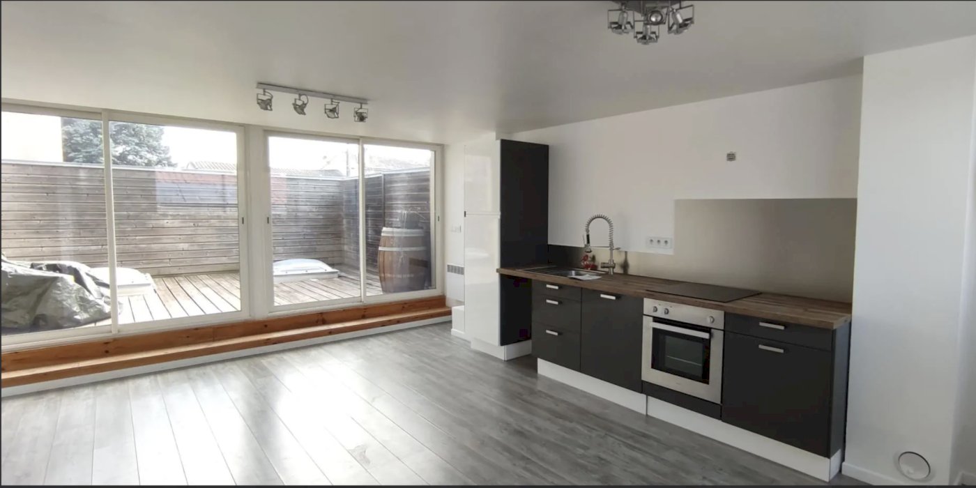- 1 séjour avec une belle cuisine équipée d’accès direct à une terrasse intimiste.