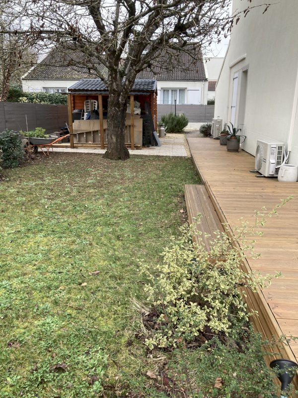 Terrain clos de 263 m², avec un chalet en bois de 10 m² avec un petit appentis et grande terrasse bois avec également un appentis.