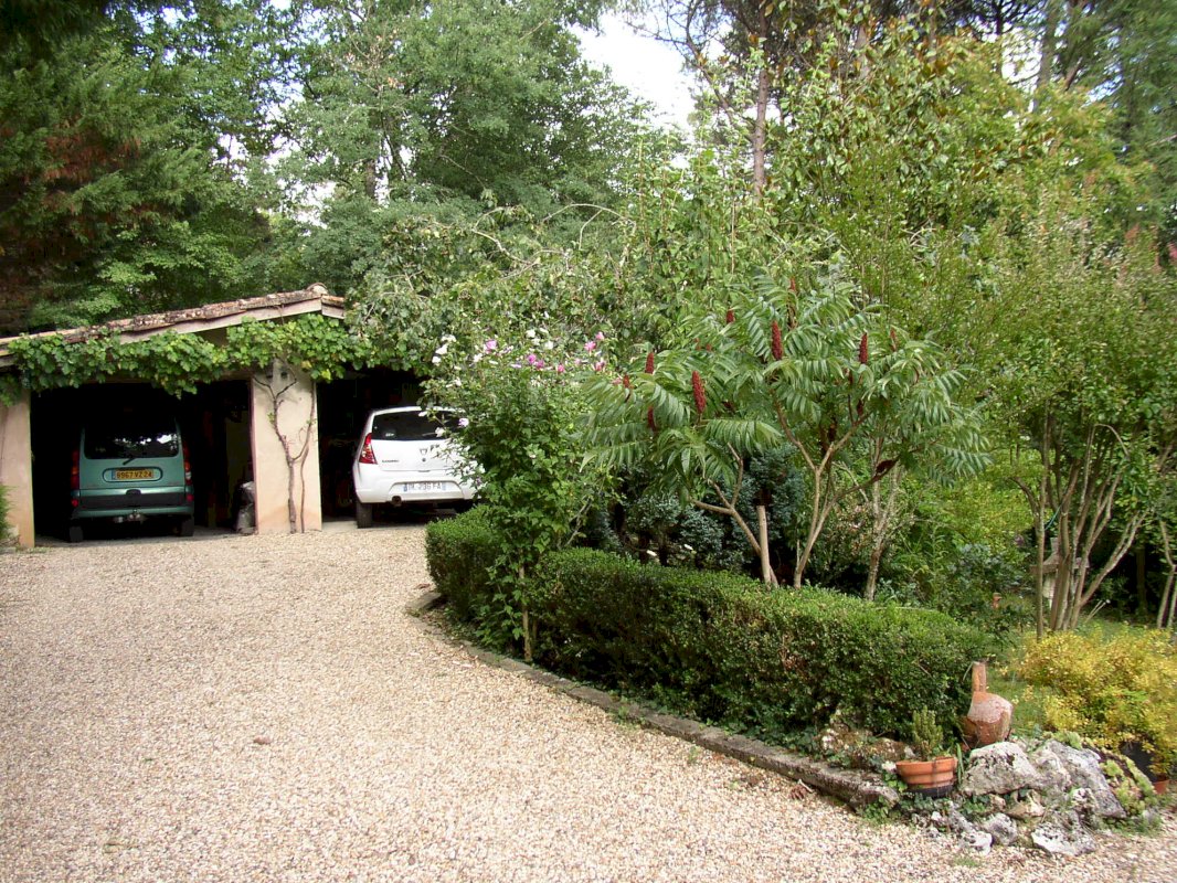 La villa dispose de 4 garages accessibles par deux entrées distinctes, chacune desservant un niveau différent de la maison (accès de plain-pied à chaque niveau), reliées par une voie privée de 700 m².
