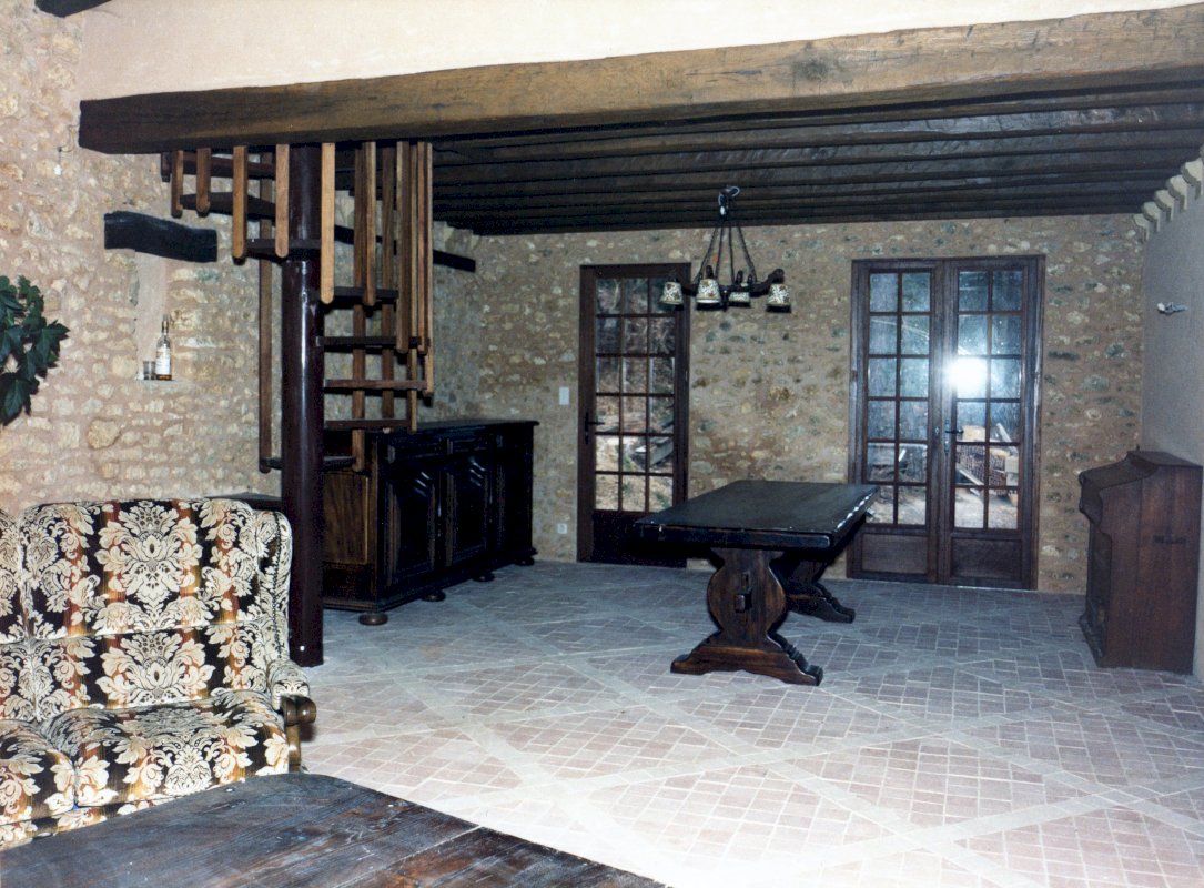 La maison offre 8 pièces, dont une magnifique salle à manger de 50 m² avec plafond voûté en pierre et cheminée équipée d’un insert récemment rénové.