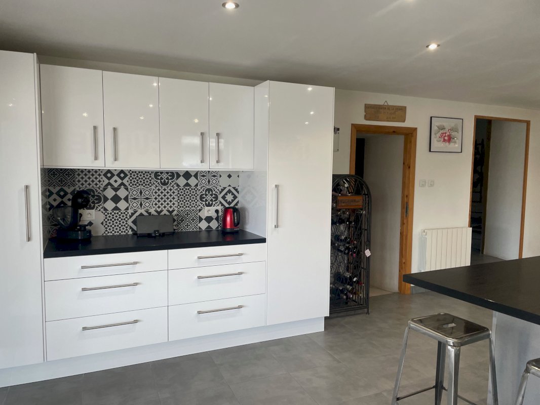 Au RDC la vaste cuisine s'ouvre sur la grande terrasse couverte et le jardin. Grand Salon, salle à manger, cellier, arrière cuisine et WC;