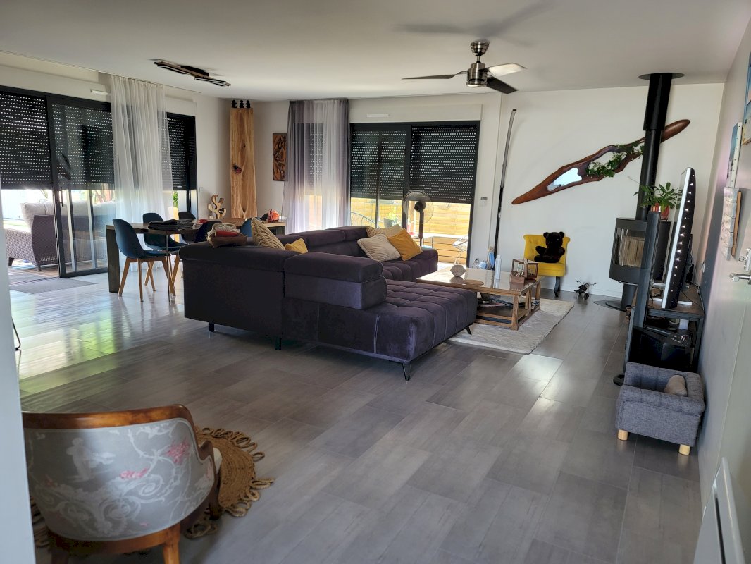 Grande pièce de vie avec cuisine ouverte équipée et cellier traversant (entrée-cuisine), donnant sur le jardin. Grande terrasse bois dont une partie couverte, piscine et local technique.