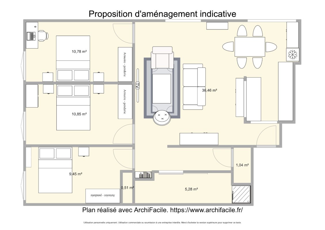 Il se compose d’un séjour/cuisine de 36 m², 3 chambres (11 m², 11 m² et 9,5 m²), une grande salle d’eau et un wc séparé. Toutes les pièces de vie bénéficient de grandes fenêtres à double vitrage et volets roulants solaires neufs.