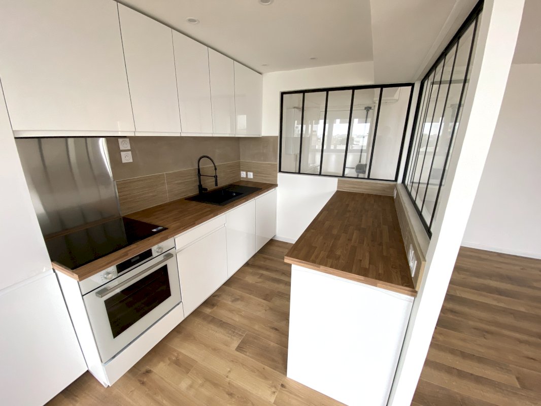 La cuisine est entièrement équipée avec du matériel de qualité. Une verrière sépare harmonieusement la cuisine et le séjour.