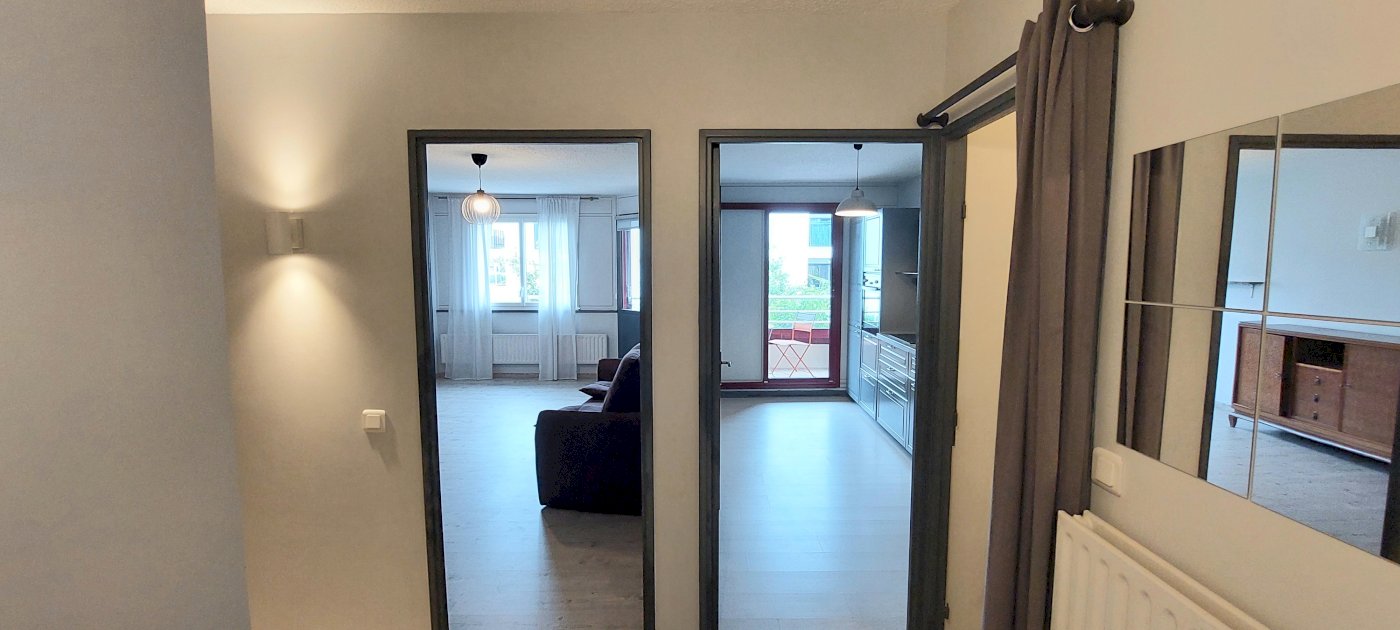 2 chambres, salon, cuisine séparée équipée, grande entrée avec placards, cellier (lave-linge, sèche-linge, planche à repasser, balais, électroménager... tout rentre !), grande salle de bains, loggia (accès cuisine et salon).