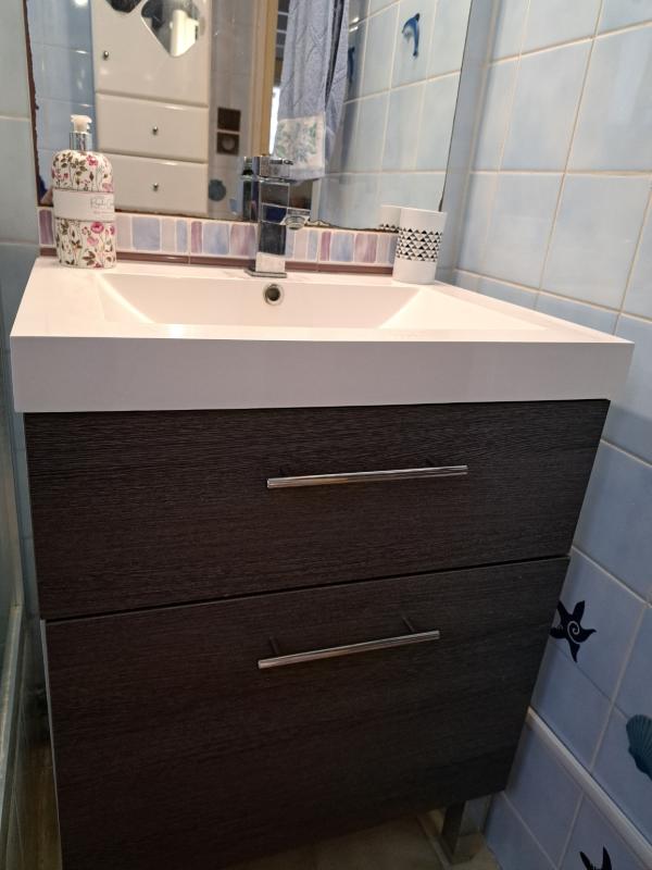 • Rez-de-chaussée : pièce de vie (meuble table vaisselier; meuble de coin; bar avec deux tabourets) coin kitchenette avec plaque vitro céramique (2 feux) hotte aspirante, meubles hauts et bas; dégagement avec placard, salle d'eau (douche ; meuble vasque; colonne et wc.