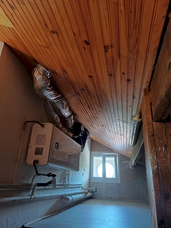 Le second grenier est en partie aménagé avec un cumulus mural de 80 litres, une VMC. Il comporte un emplacement pour une machine à laver et bouteille de gaz butane.