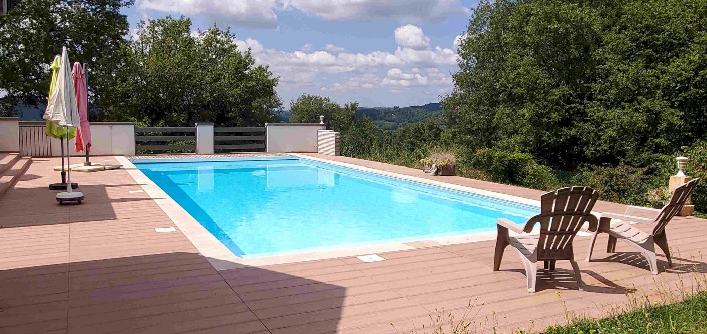 Une piscine spacieuse (12m x 5,5 m) comprenant un escalier sur toute sa largeur, équipée d'un liner armé avec ligne d'eau carrelée, d'un volet immergé motorisé, d'un dispositif à électrolyse de sel et d'un régulateur de PH. Les plages sont en grès cérame aspect bois et les margelles affleurantes en pierre de Limeyrat.