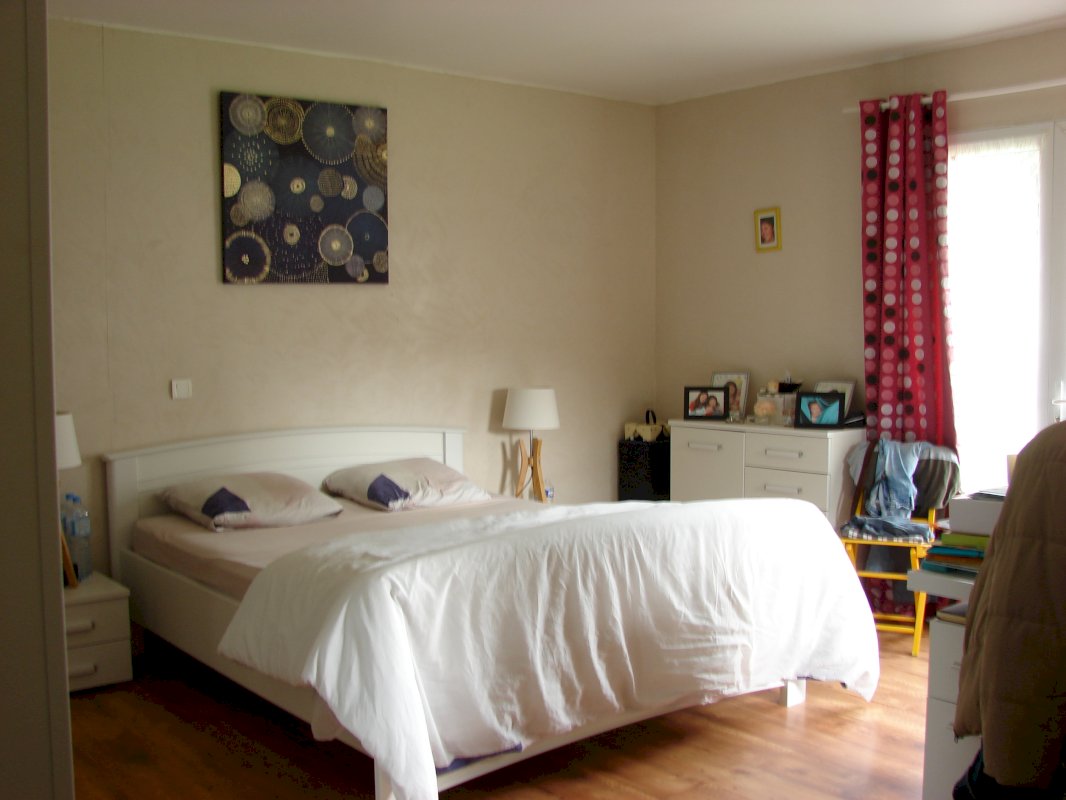 1 dégagement avec wc menant à une grande chambre de 23 m2 avec salle de de bains de 10 m2, baignoire d'angle, 2 meubles vasque, douche et wc