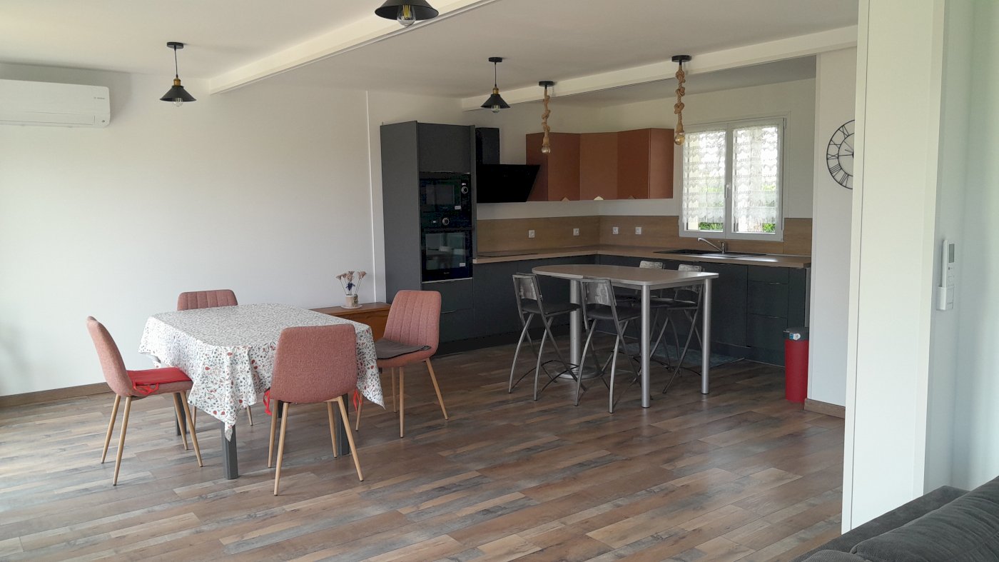 Dans petit village à Ozillac, maison en ossature bois de 2024 comportant une grande pièce à vivre et 2 chambres et une 3ème chambre est possible facilement, salle de douche, plus salle de bain, cuisine aménagée, avec terrasse donnant sur un jardin avec piscine water-air de 20 m3.