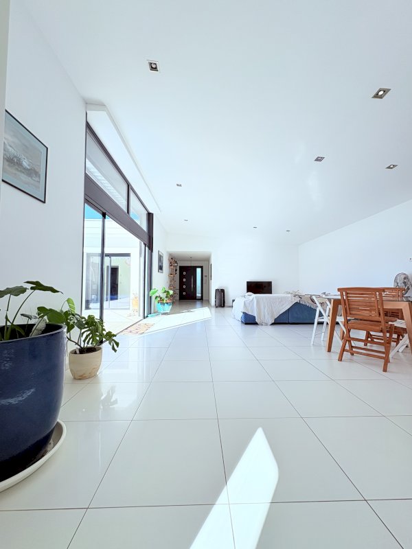 La pièce de vie spacieuse et baignée de lumière s’ouvre grâce à ses baies vitrées à galandage sur une grande terrasse carrelée et une piscine 10x5, offrant un véritable espace de détente et de convivialité.