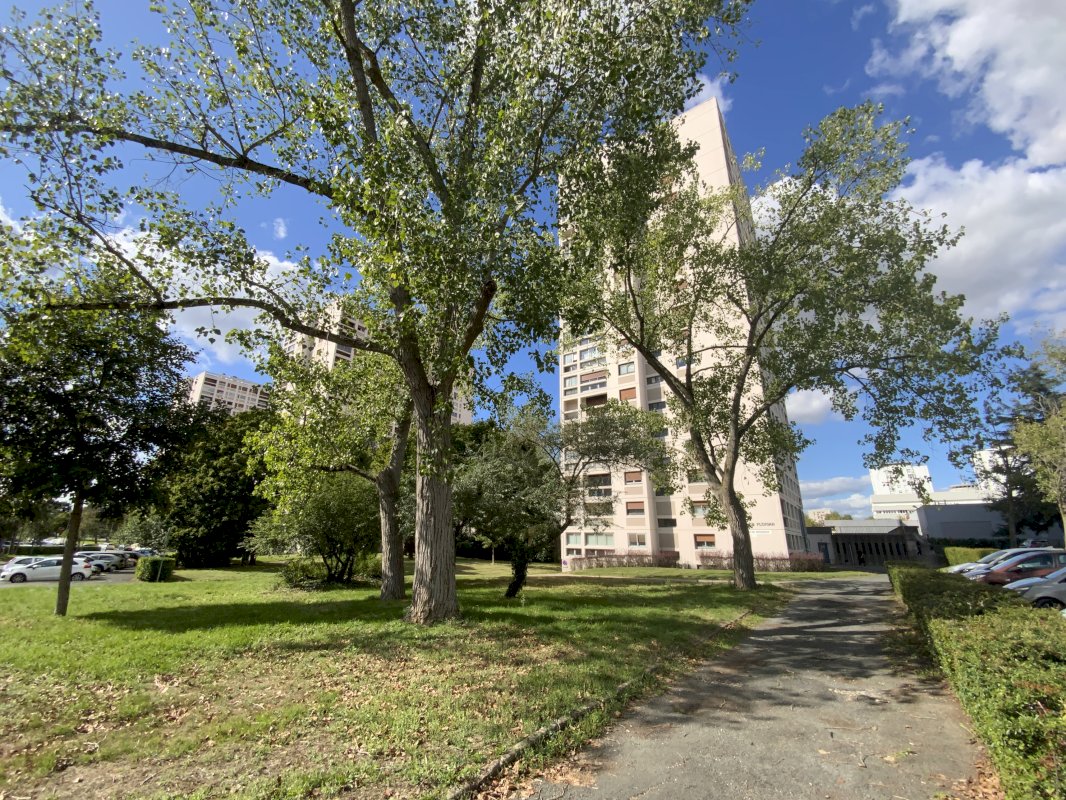 Le coin jour offre un séjour-salon lumineux ouvrant sur un balcon avec vue sur la nouvelle école Audiovisuel & cinéma, ainsi qu'une cuisine équipée et un cellier pratique.