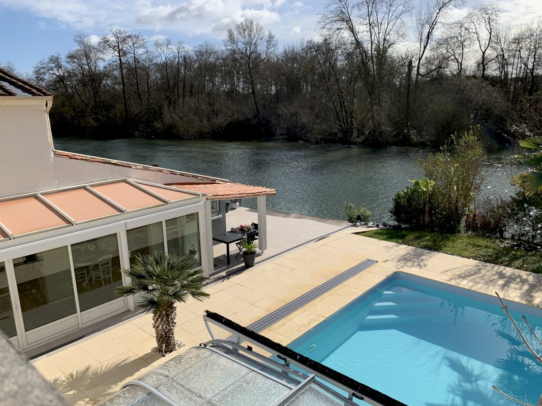 Cuisine intégrée avec bcp de rangements, frigo américain, four tradi, four micro onde, four vapeur, lave vaisselle, poêle à granulés, grand salon meublé de 47 m² attenant à la cuisine et le tout donnant sur la piscine, cheminée insert chazelles, 3 chambres meublées avec chacune sa salle de bain, dressing, bureau, 2 WC, 2 terrasses avec piscine au sel et dôme coulissant de 7 m sur 3,5, local sous parking 2 places pour bois ou autre de 12 m², cave scellier de 13 m², ponton et terrasse en bois donnant sur l'eau.