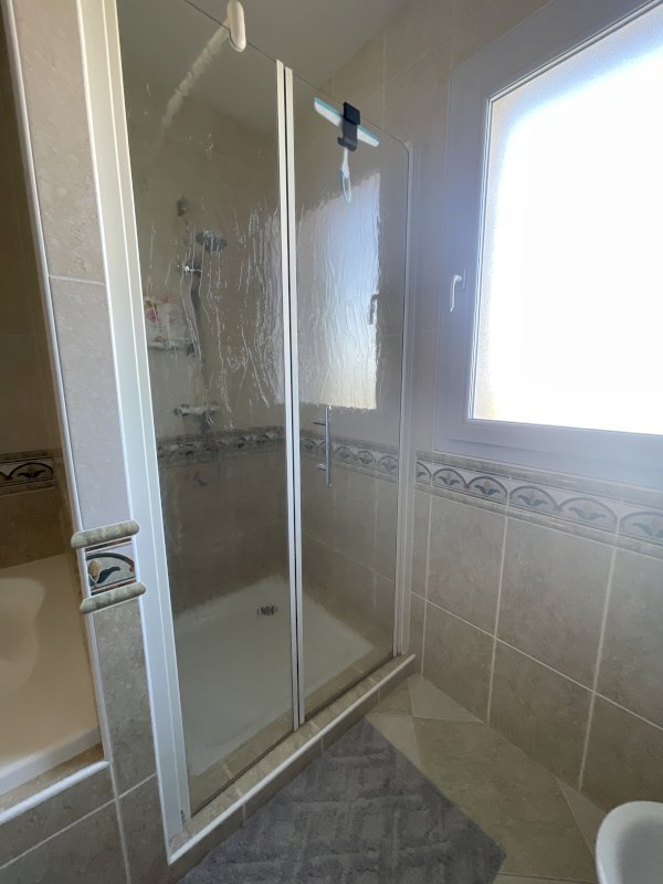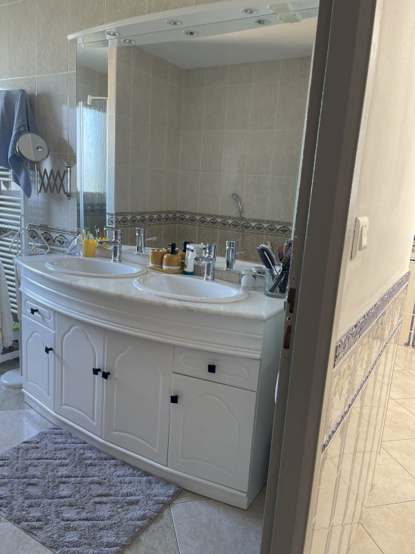 En haut il y a 2 chambres avec placard, plus une suite parentale, une salle de bain avec douche, wc et vasque. Une salle de bain avec baignoire, bidet, sèche serviettes et meuble aves deux vasques. Un WC individuel.