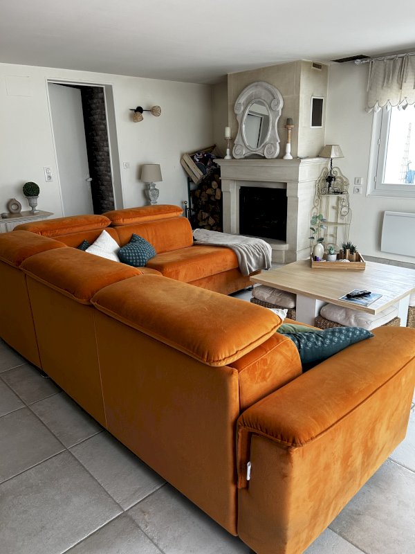 De beaux volumes généreux. Salon séjour de 50 m² avec une belle cheminée en pierre.