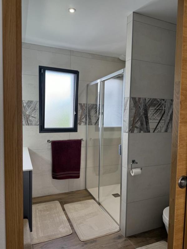 Carrelage partout et chauffage par pompe à chaleur au sol.