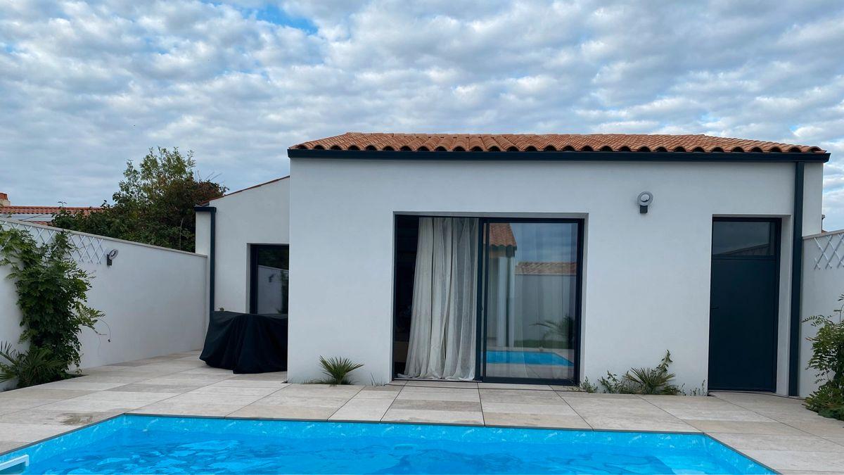 Maison de plain pied 5 pièces (137m² habitable) avec piscine + garage (~20m²). Cette propriété sur un terrain de 437 m² propose un jardin clos.