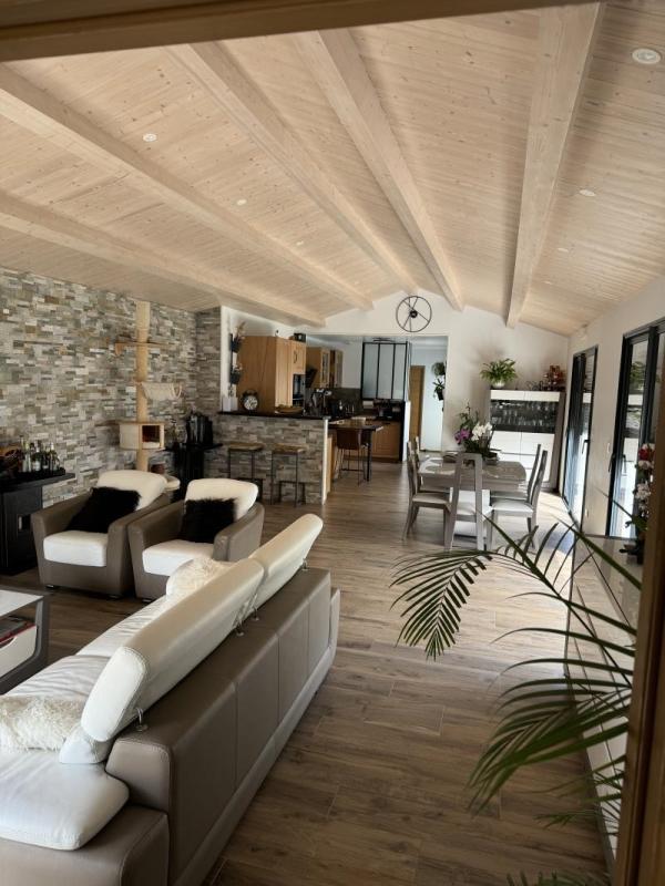 - une cuisine aménagée et équipée (plaque, hotte, four, lave-vaisselle, frigo, micro-ondes) ouverte sur séjour-salon offrent des espaces chaleureux pour la vie quotidienne, le tout donnant sur le jardin clos avec piscine,