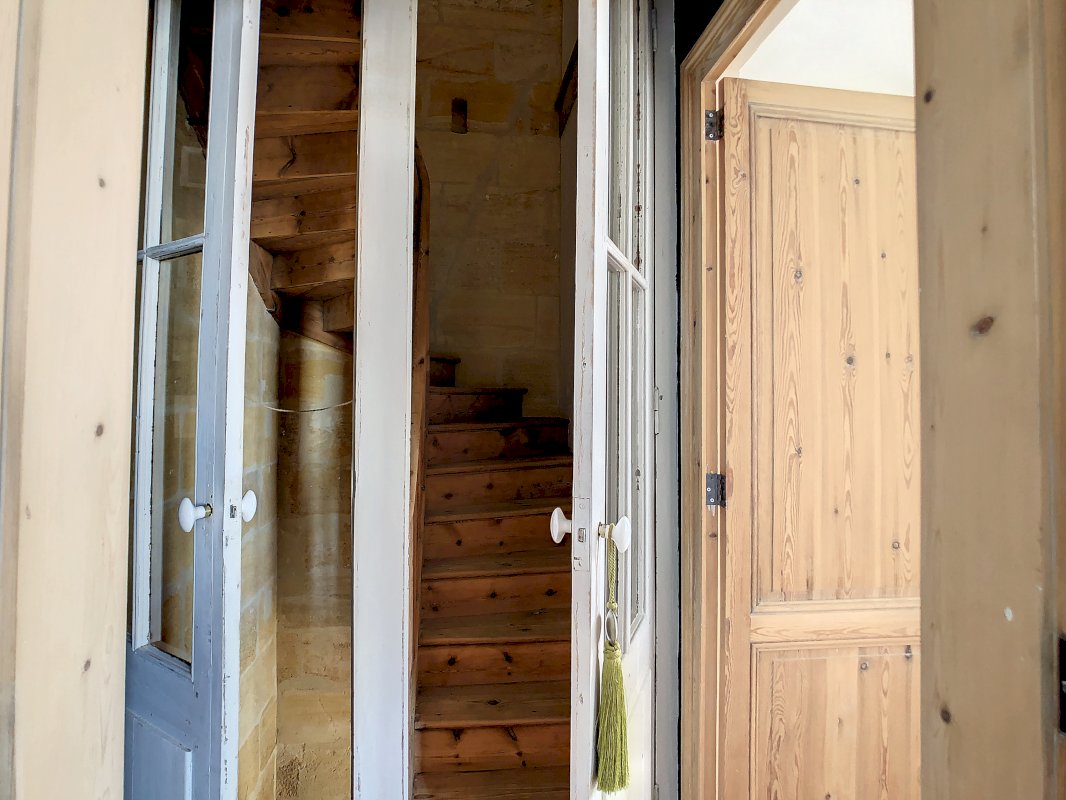 Après la montée des marches, au total 6, (maison sur vide sanitaire hauteur 1mètre), entrez dans la pièce de vie (35m²) et apercevez tout de suite l’ancien escalier de bois dominant celle-ci, la jolie cheminée au foyer ouvert et la magnifique vue sur la Garonne