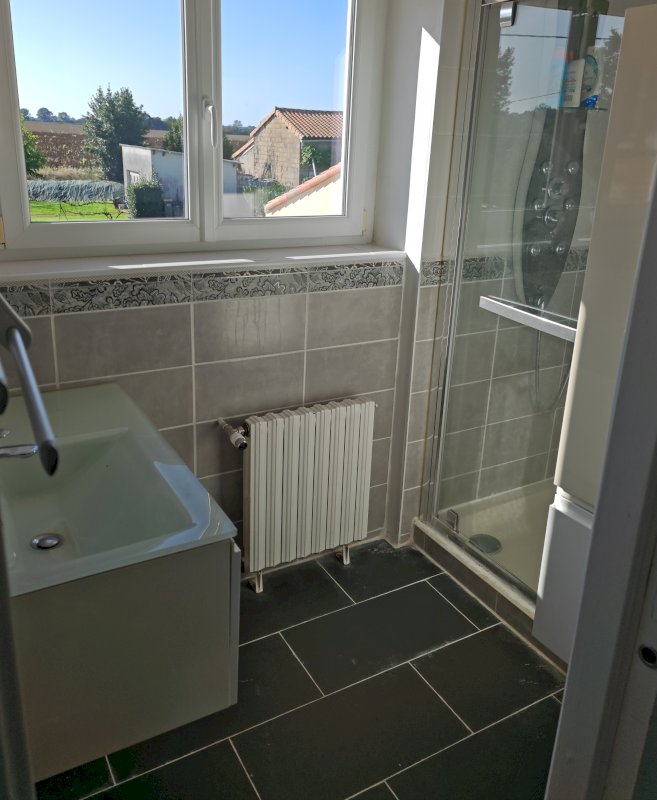 - Une salle d'eau avec un meuble vasque simple et une cabine de douche.