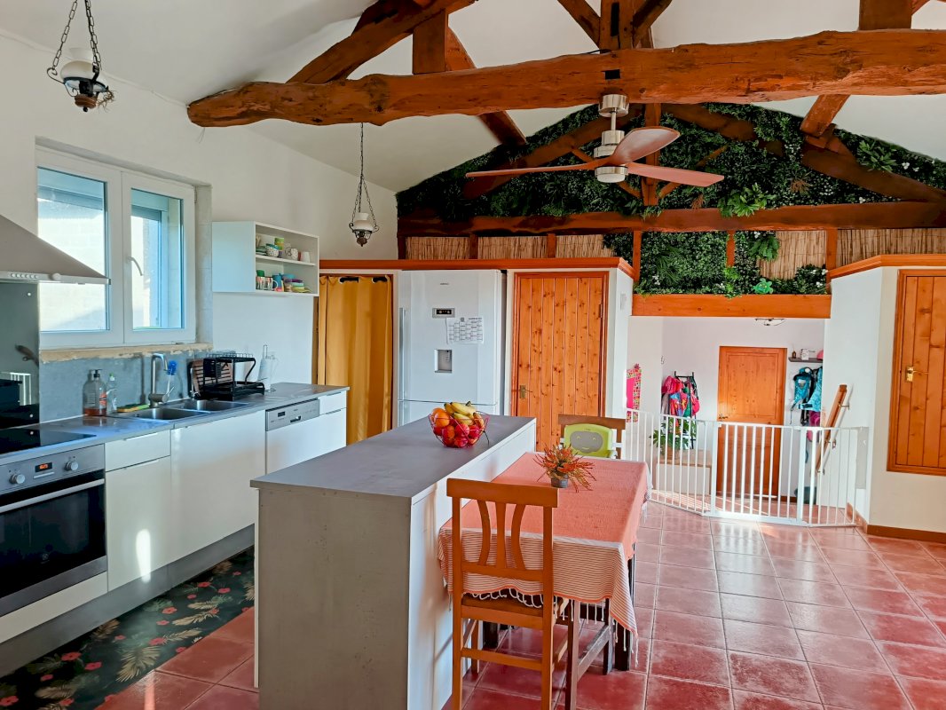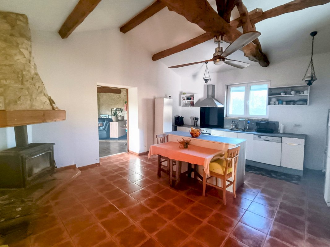Salon chaleureux (41 m²) avec poêle à granulés et grande cuisine (32 m²) équipée avec poêle à bois.
