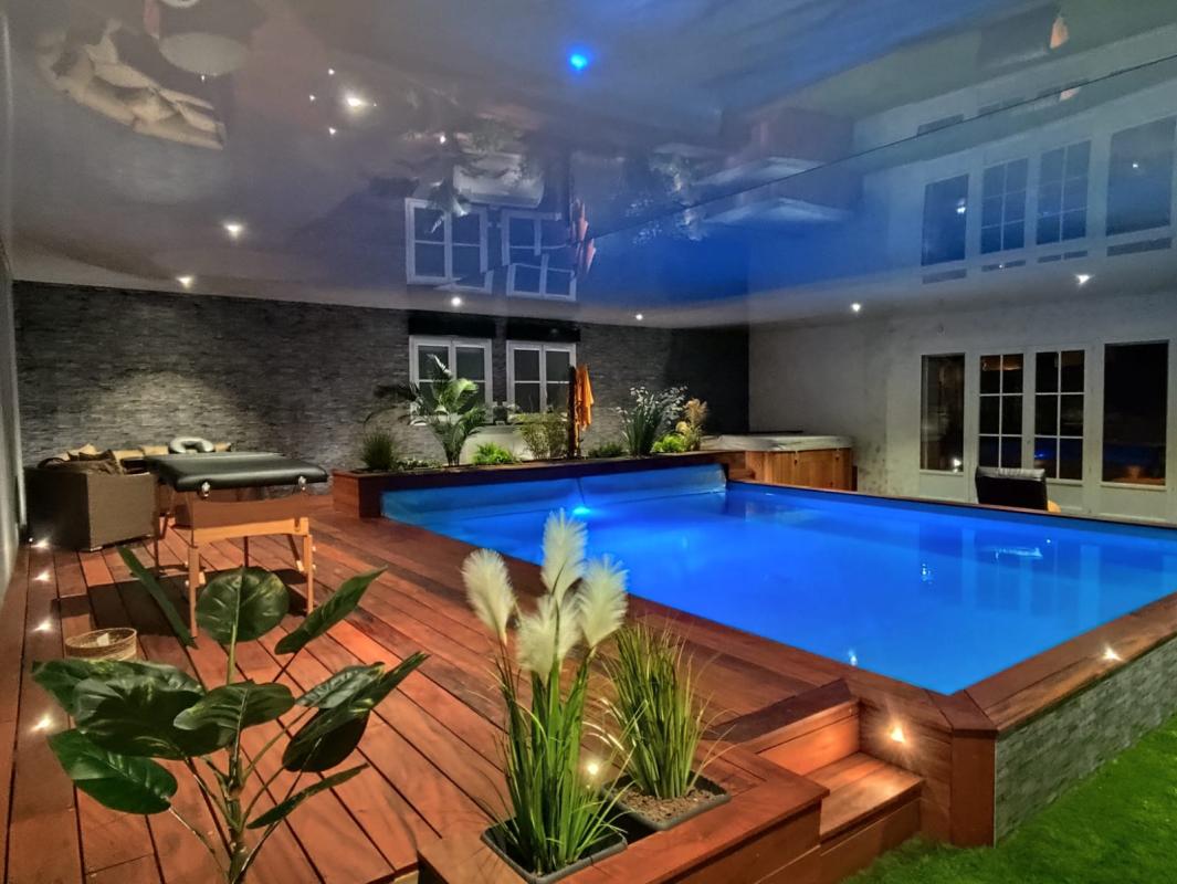 - espace aquatique de 113m² : piscine intérieure 30°C toute l’année, 6m x 5m, et spa 6 places, l’ensemble entouré d’une terrasse en bois exotique. Chauffage de la piscine par pompe à chaleur. Un vestiaire est dédié à cet espace avec sanitaire et douche