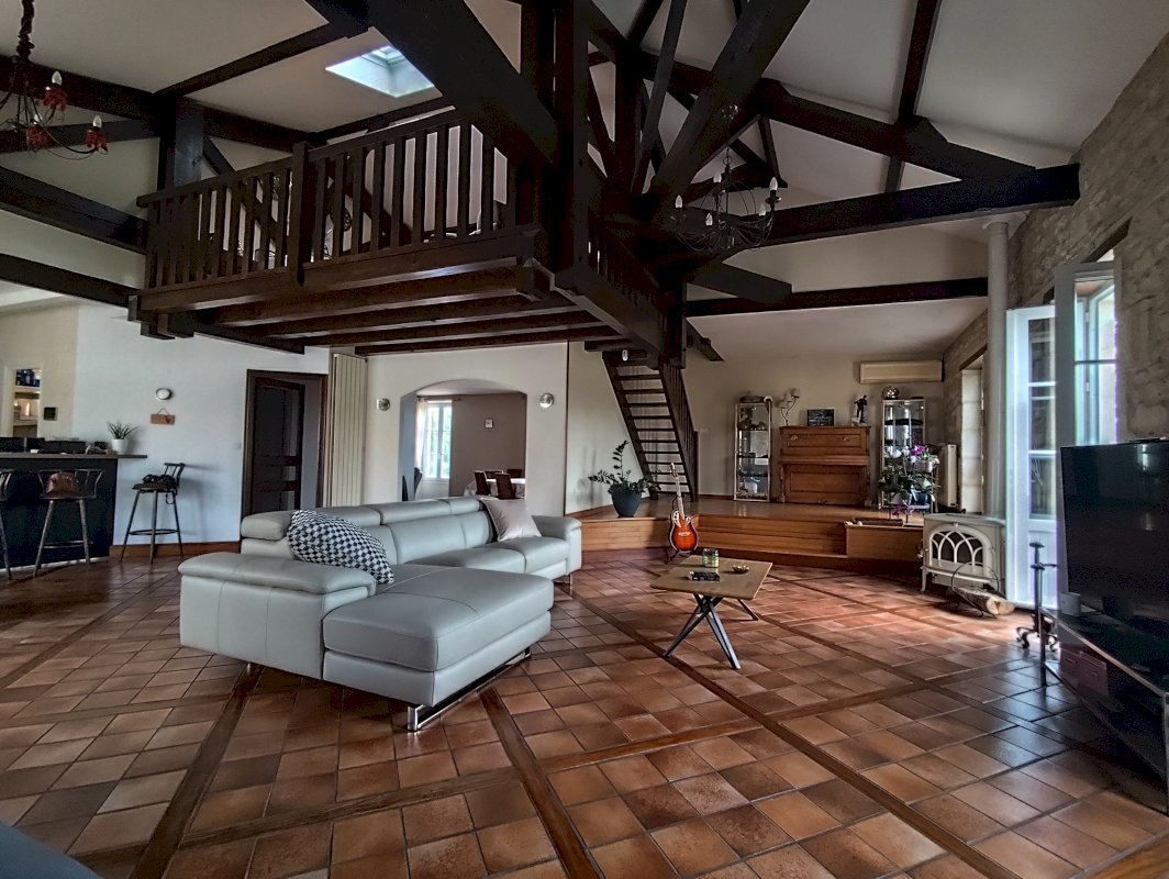 Depuis l’entrée, avec placards, un bel escalier en bois dessert une pièce de vie de 72m² avec plafond cathédrale, charpente apparente, belle cheminé, mezzanine avec rangement. Une salle à manger de 30m² et une cuisine ouverte équipée de 12m² avec cellier attenant composent cet ensemble donnant sur une terrasse de 57m² exposée plein sud avec store électrique, à l’abri de tous les regards.