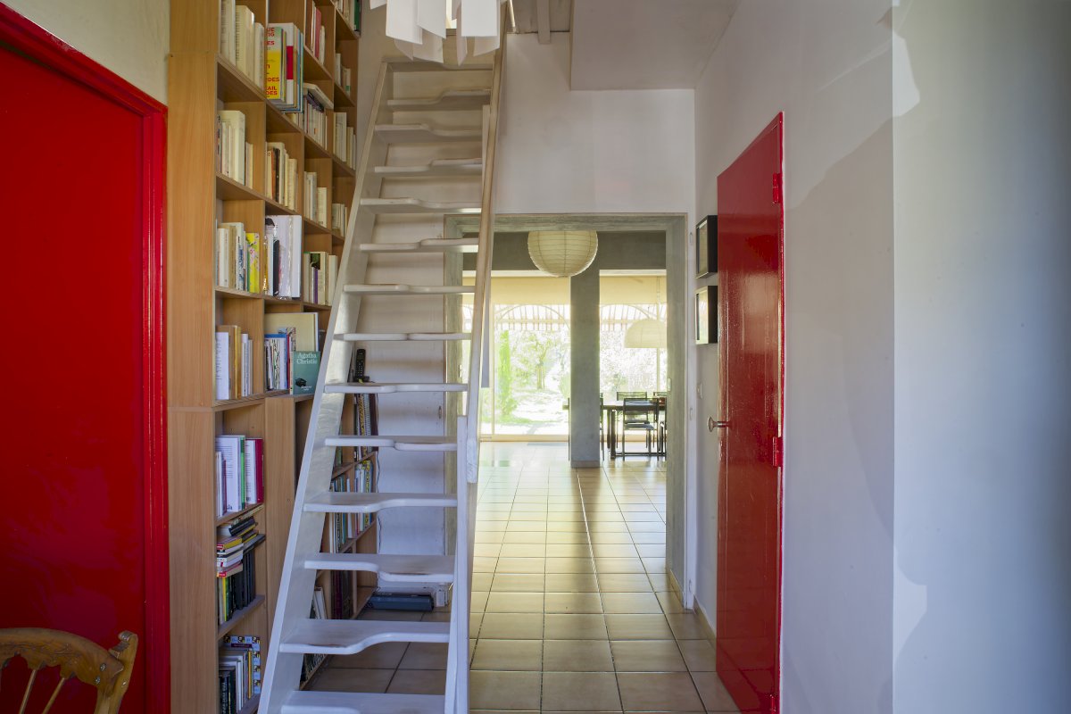 Les baies vitrées de la salle à manger s’ouvrent sur un véritable petit verger ombragé l’été et généreux (cerises, pèches, pommes, poires, raisins, feijoas, amandes, abricots) avec son cabanon pour ranger vélos et outils.