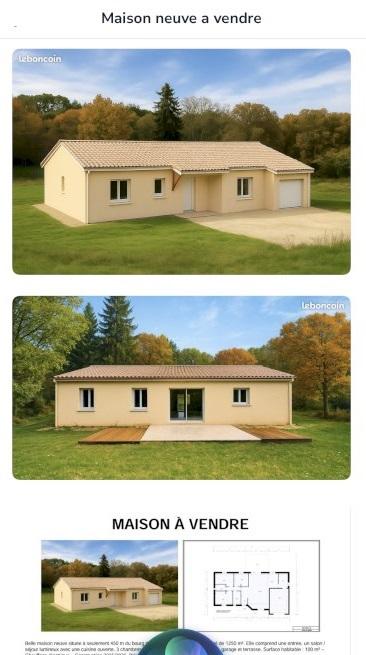 Maison de plain-pied sur 1250 m² de terrain avec trois chambres, un grand salon, salle à manger cuisine cellier, garage 30 m², salle de bain, WC avec fenêtre, extérieur, peinture intérieure, blanc Maison neuve avec décennale.