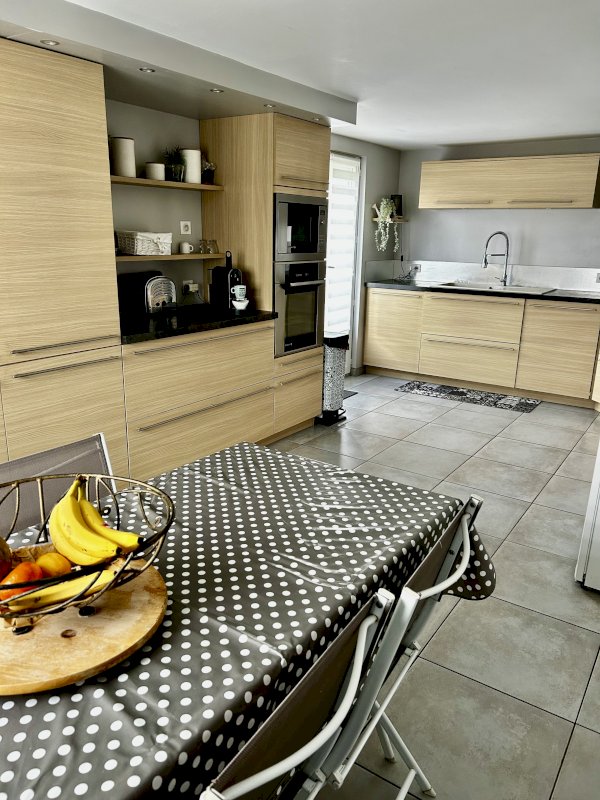 La cuisine indépendante de 20 m² équipée, nombreux rangements pratiques.