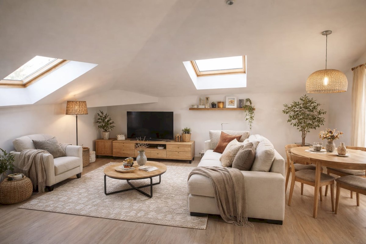 Il se compose : entrée, cuisine ouverte, salon, sdb et deux chambres pour une surface de 90 m² (dont 29 m² en dessous 1.80m).