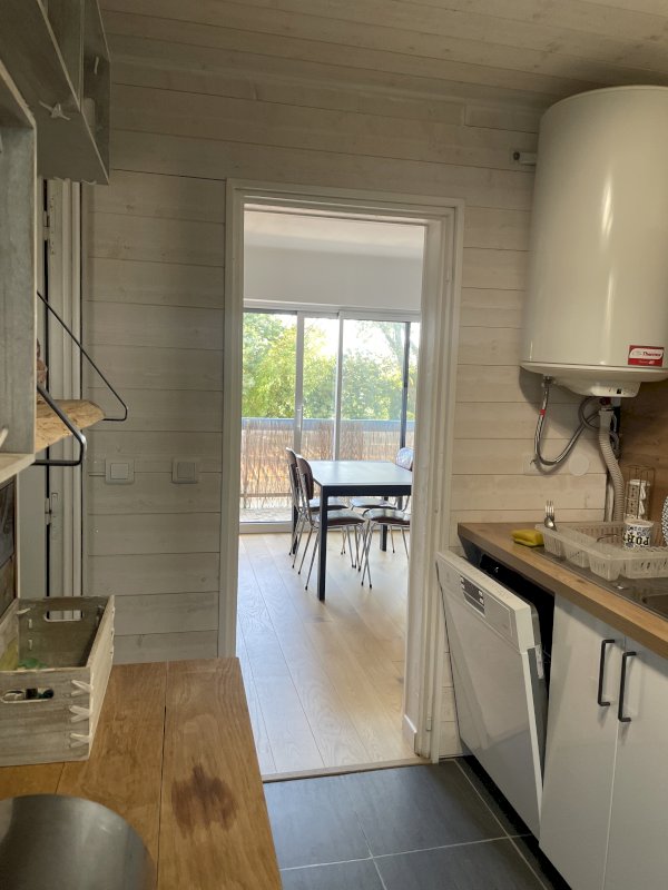 1 cuisine équipée (plaque vitrocéramique, four, réfrigérateur, micro-ondes, lave-vaisselle...) donnant sur un autre balcon;