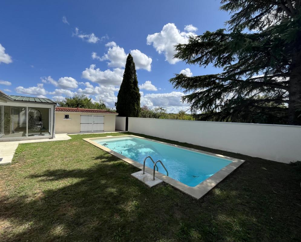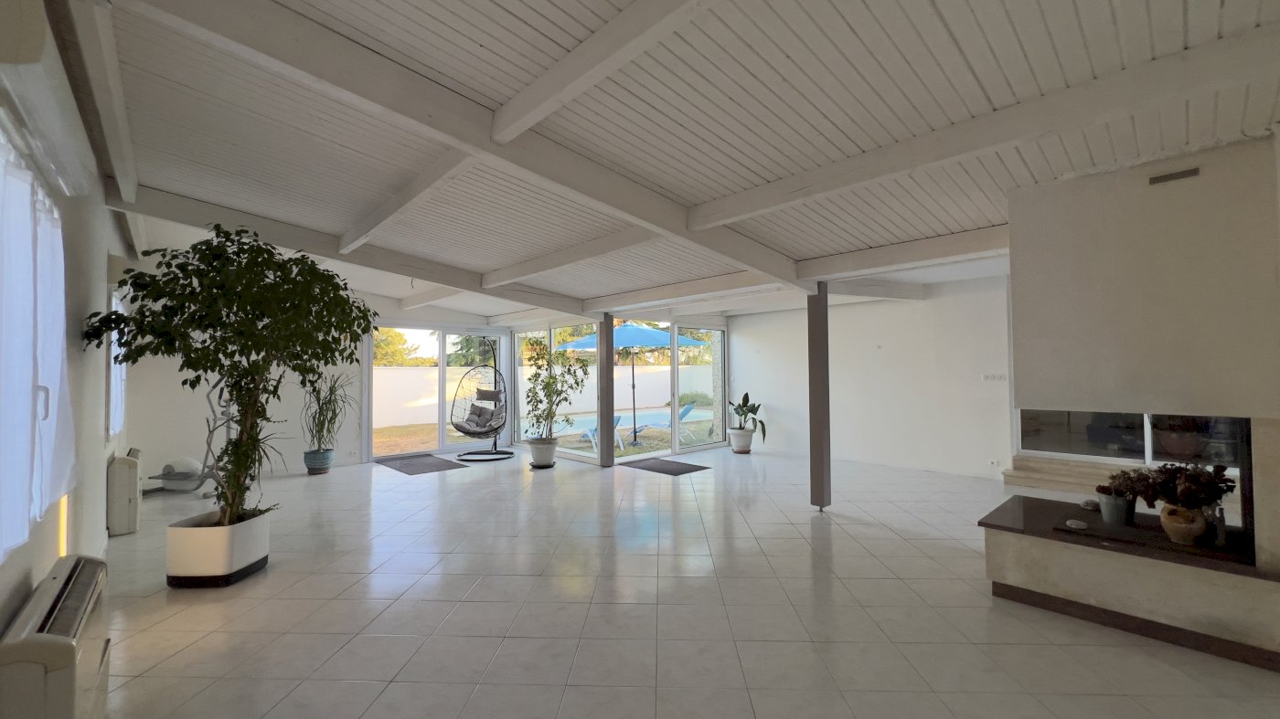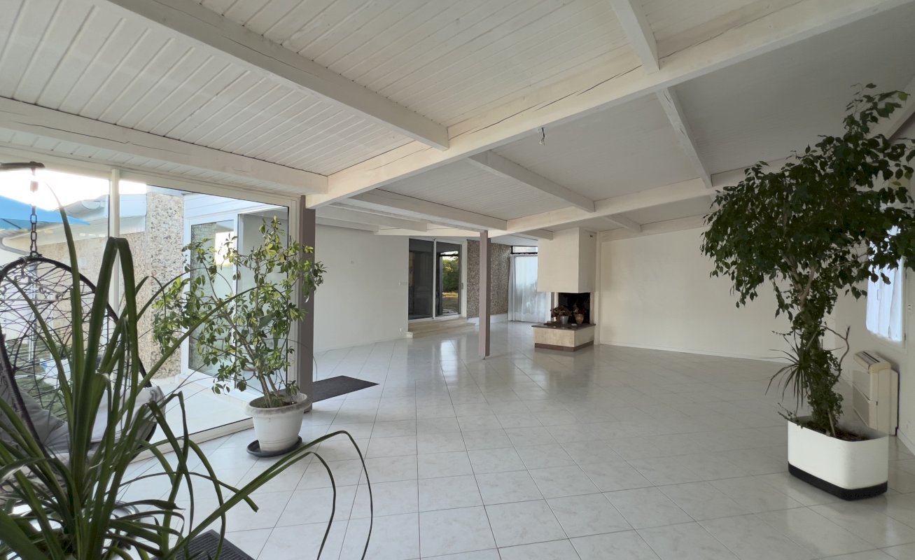 Un salon lumineux de 83 m² avec clim réversible et cheminée ouverte donne un accés direct à la piscine au sel de 9X4 (liner de 2024) avec son poolhouse équipé d'un coin cuisine, salle d'eau et WC.