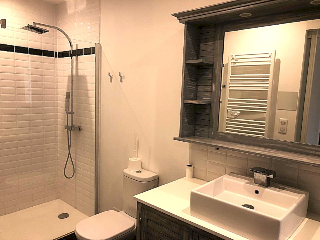 • A l'étage : 2 chambres, une avec salle d'eau, douche à l'italienne et WC et la deuxième avec cabinet de toilette.