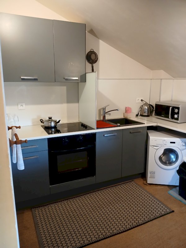 Coin cuisine, coin chambre, coin salon, le logement se situe dans rue piétonne, plein coeur historique classé, les 3 fenêtres donnent sur deux cours calmes.