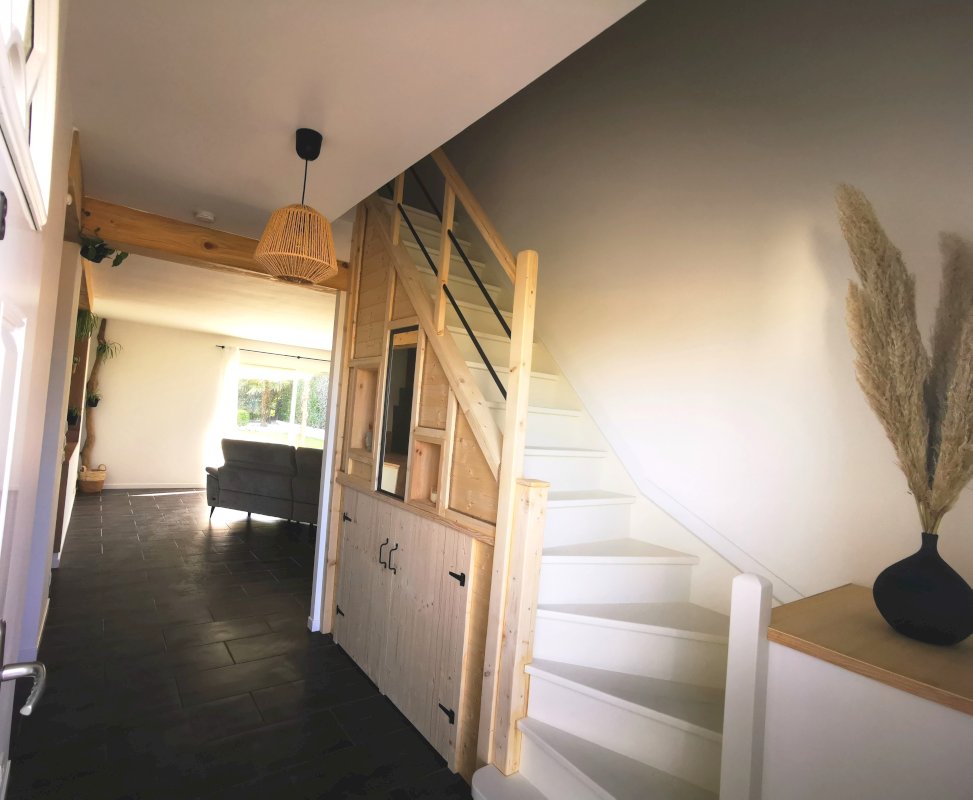 Vous trouverez au RDC: une entrée avec placards, un wc, une chambre avec placards et sa propre salle d'eau, un grand séjour (avec poêle à bois) et une cuisine ouverte d'environ 60m², une grande buanderie et un grand garage.