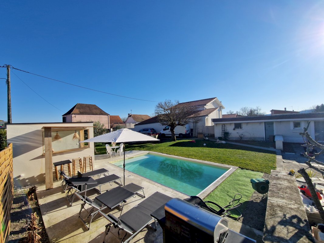 Un extérieur qui invite à la détente et à la convivialité, trampoline enterré, piscine au sel, pool housse avec WC, local technique, cuisine d'été et garage.