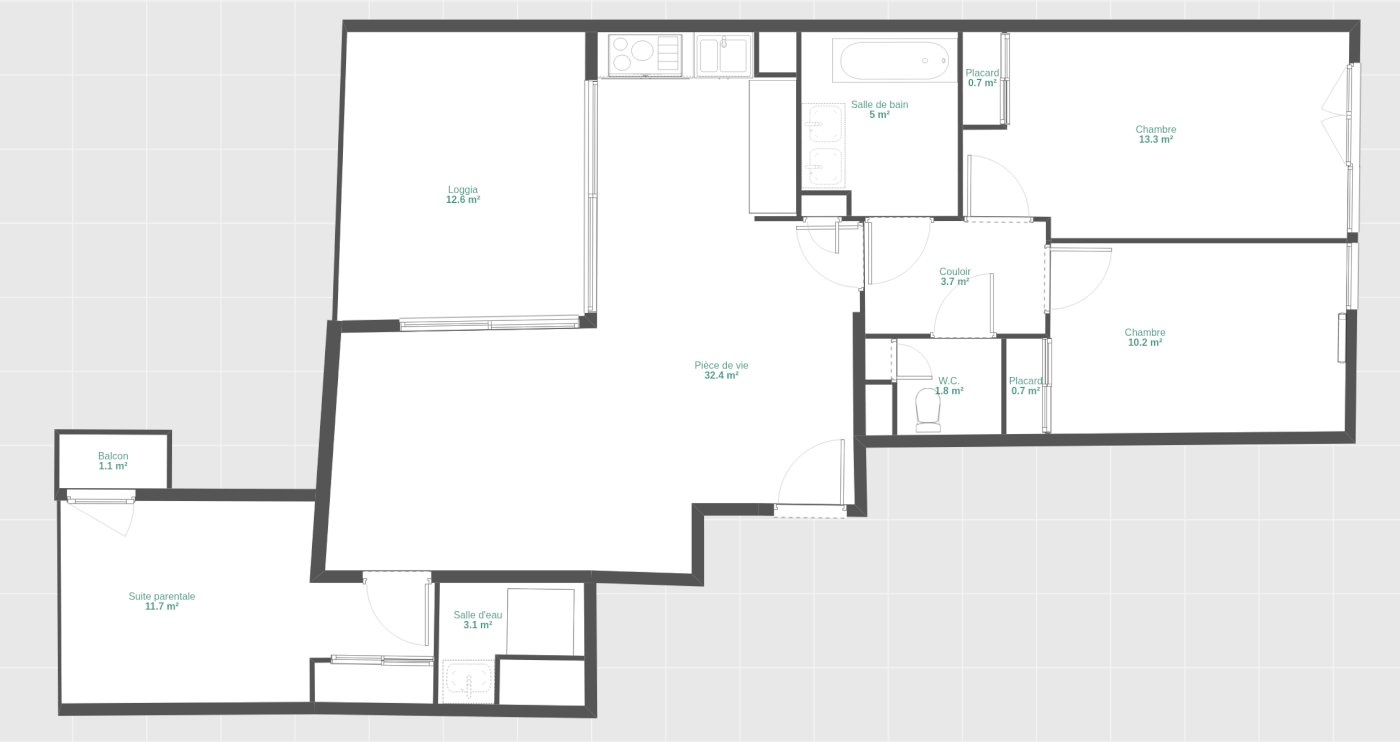 Il dispose de trois espaces distincts : un espace jour, un espace nuit et une suite parentale. La suite parentale possède sa propre salle d'eau. Les deux autres chambres de l'espace nuit partagent une salle de bain indépendante et des WC séparés. De nombreux placards intégrés sont également présents.