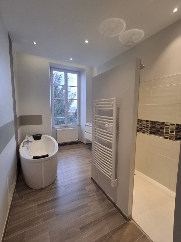 • Au 1er étage : palier avec grand placard, chambre (18m²), salle de bain (10m²) avec baignoire/douche/double vasque. WC et pièce dressing (7m²).