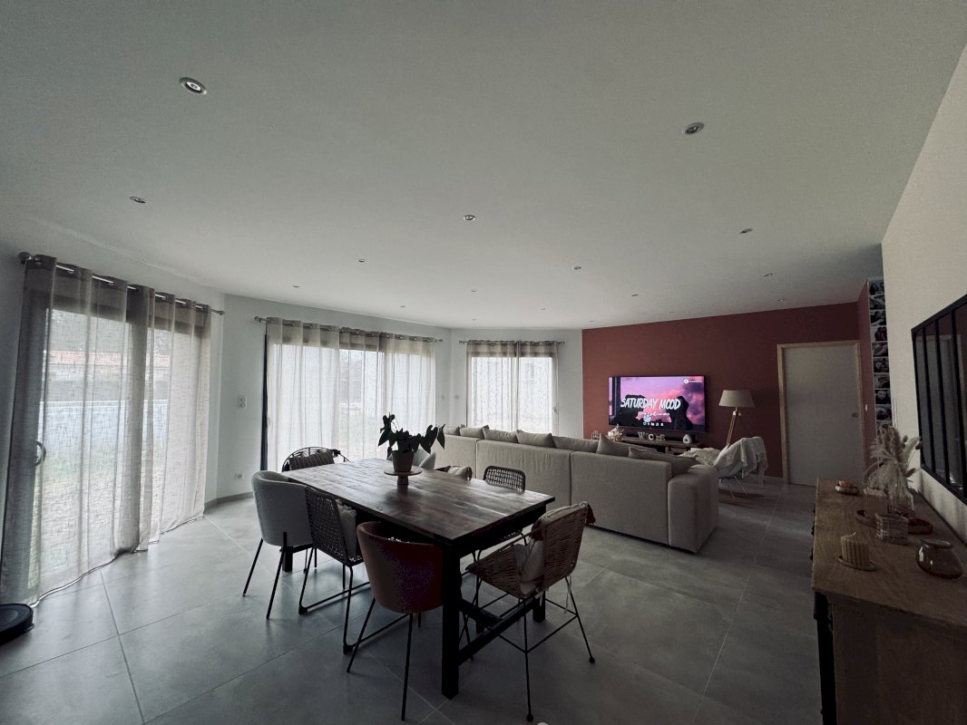 - La cuisine est équipée et ouverte sur une grande pièce de vie lumineuse de 60 m² environ.