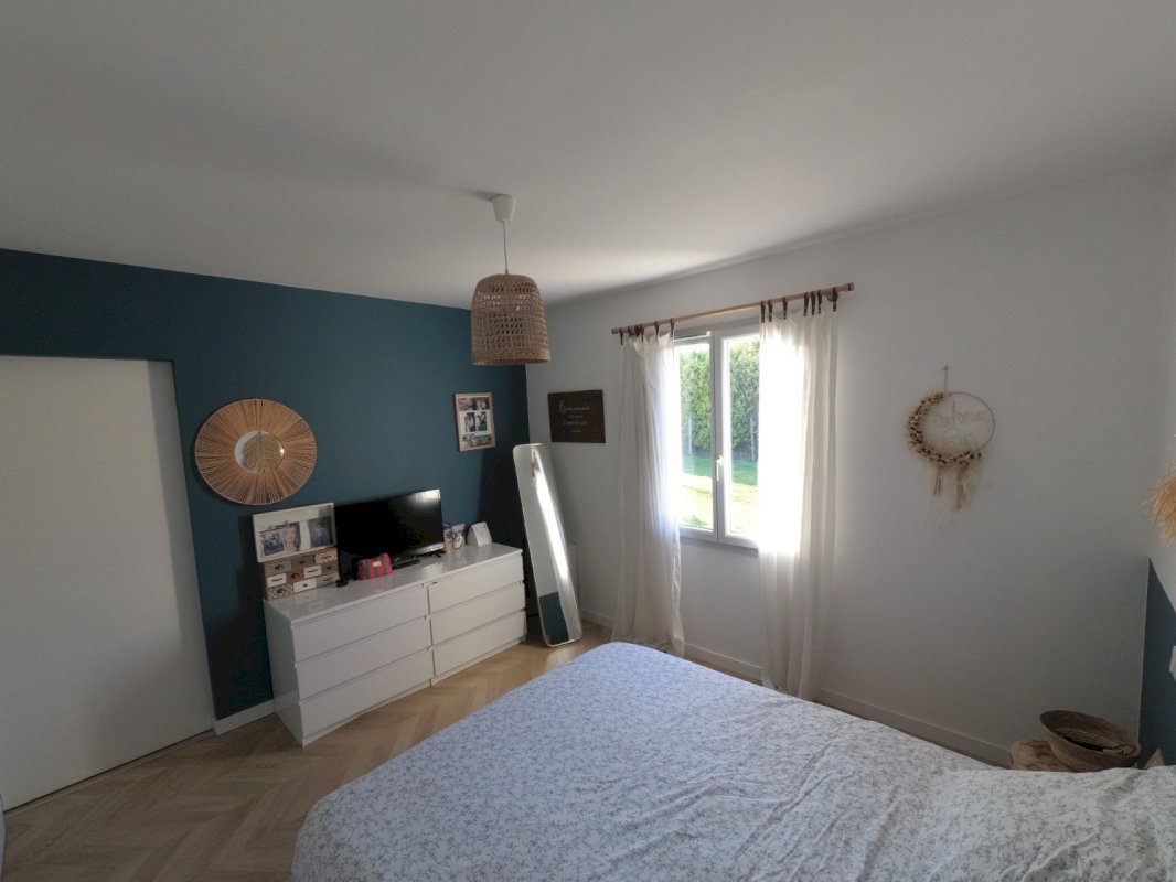 La maison dispose de 3 chambres dont une suite parentale avec dressing et 2 chambres avec placard intégré, une salle de bain douche plus baignoire, un wc, un cellier et une grande pièce de vie très lumineuse de 57m² (3 baies vitrées exposées est, sud et ouest) avec cuisine équipée ouverte et ilot centrale agrémenté d'un plafond haut.
