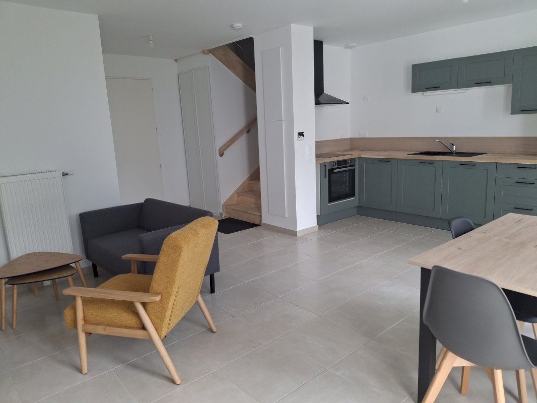 Une pièce de vie de 30 m² avec une cuisine aménagée moderne (plaque à induction, four à chaleur tournante, lave-vaisselle intégré, réfrigérateur-congélateur), un grand placard sous l'escalier, une salle d'eau avec fenêtre, douche à l'italienne, lavabo et un WC, une chambre de 11,47 m².