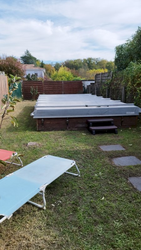 Extérieur avant disposant d’un cabanon de jardin et possibilité de stationner 4 véhicules. Sur l’arrière, petite véranda fonctionnelle donnant sur un patio avec voile d'ombrage et terrasse carrelée. Jardin avec piscine semi enterrée.