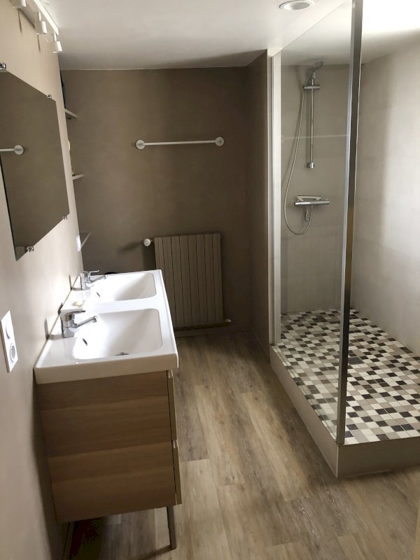 • Au RDC : L'entrée et le salon sont sur dalles de pierre ancienne, la Sam sur parquet de châtaignier. On y trouve aussi une grande cuisine avec accès sur terrasse, une buanderie et un garage avec fosse à vidange.