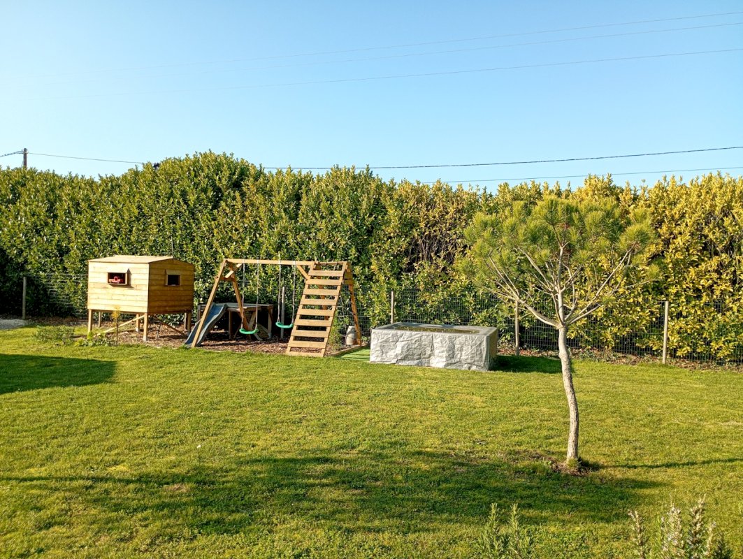 Elle dispose d'un grand terrain arboré et clôturé avec 2 accès via portails et larges allées pour se garer facilement sous 2 carports. Plus un garage indépendant de 20m² et une dépense type cuisine d'été de 16m² avec wc, douche, évier et terrasse 20m² sud/est.