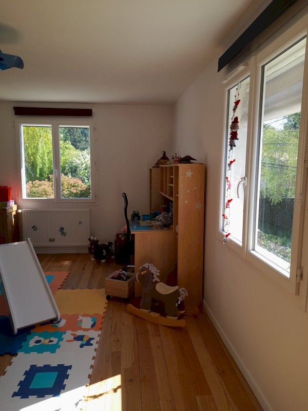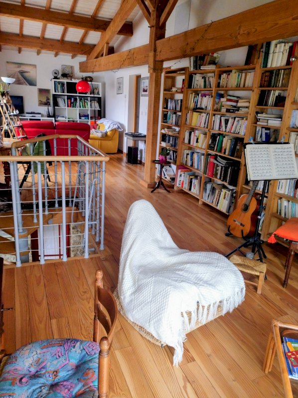 A l'étage, un appartement à visée locative est aménagé, avec une grande chambre, une petite, une cuisine/séjour et une salle de bain. De l'entrée, un escalier mène à un salon/séjour de 44 m² avec poutres apparentes et parquet de bois et 4 autres chambres très grandes ainsi qu'une salle d'eau/WC.