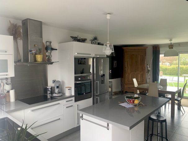 Cette construction est composée de 2 chambres, salle de bains avec douche italienne et double vasques, une pièce de vie de 44 m² avec cuisine équipée et îlot, une baie vitrée donnant sur le jardin avec une terrasse de 22 m² avec partie ombragée pour partie, la piscine de 27 m² équipée d’une pompe à chaleur et un local technique de 9 m² sur dalle.