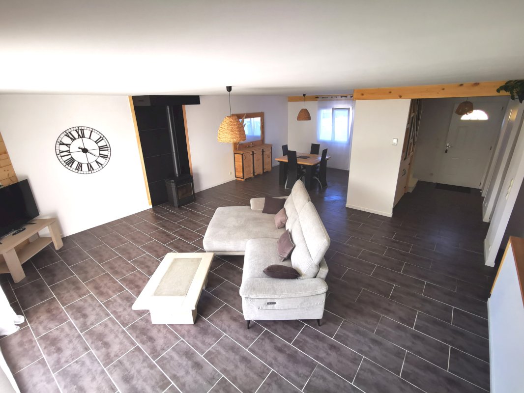 Vous trouverez au RDC: une entrée avec placards, un wc, une chambre avec placards et sa propre salle d'eau, un grand séjour (avec poêle à bois) et une cuisine ouverte d'environ 60m², une grande buanderie et un grand garage.